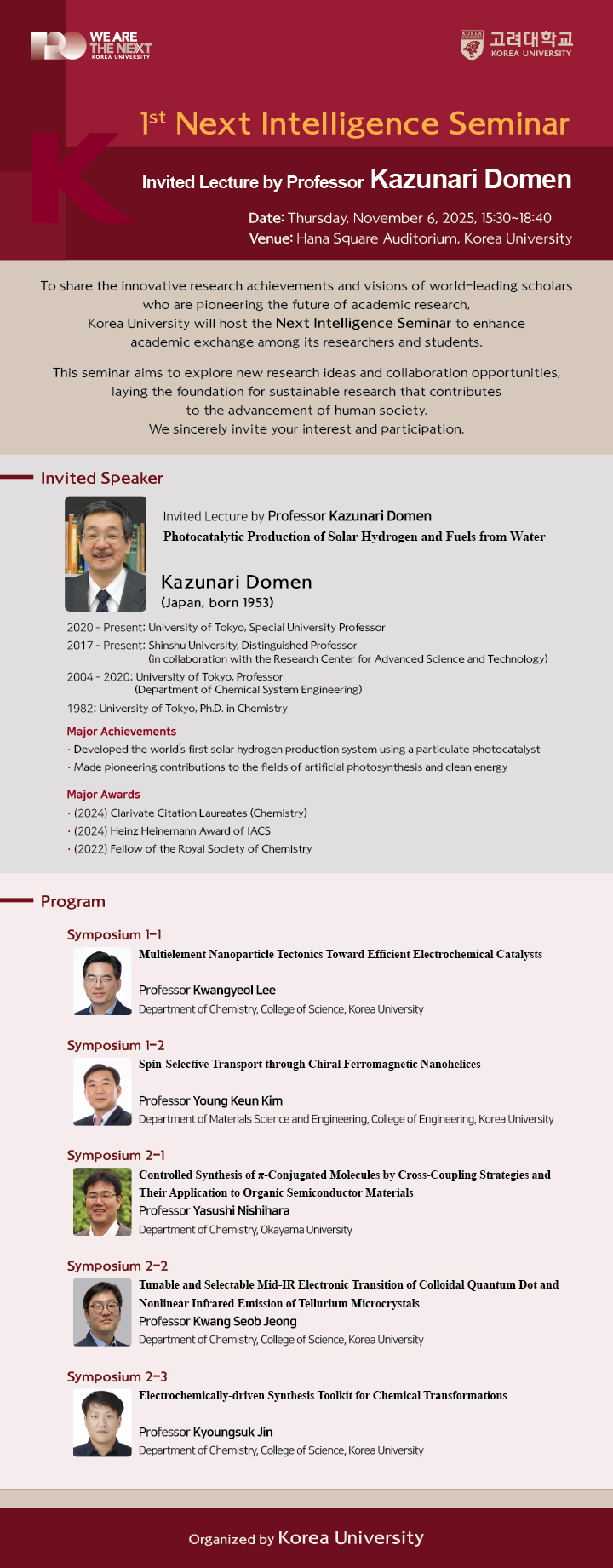 | 제목 | Kazunari Domen 교수 초청, 제1회 Next Intelligence Seminar 개최 안내-11/6 |